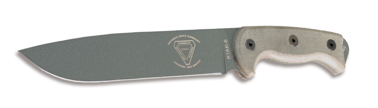 You can rest assured the OKC RTAK-II knife will stand the test of durability. The RTAK-II features a 5160 steel construction full tang blade with lanyard hole in the butt. The blade is has a foliage green texture powder coated finish. The handles on the RTAK-II are made from canvas Micarta. This knife comes standard with MOLLE compatible black nylon sheath with edge protecting hard plastic insert and roomy utility pouch.